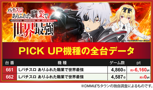 14日(日曜日)もにぎやかな台が多く、「Lパチスロ ありふれた職業で世界最強」の661番台が約+12,770pt!