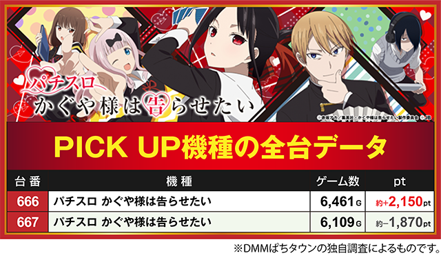 「Lパチスロ ありふれた職業で世界最強」では661番台が約+6,100ptオーバー、「パチスロ かぐや様は告らせたい」の666番台も約+2,100ptを超えた。
