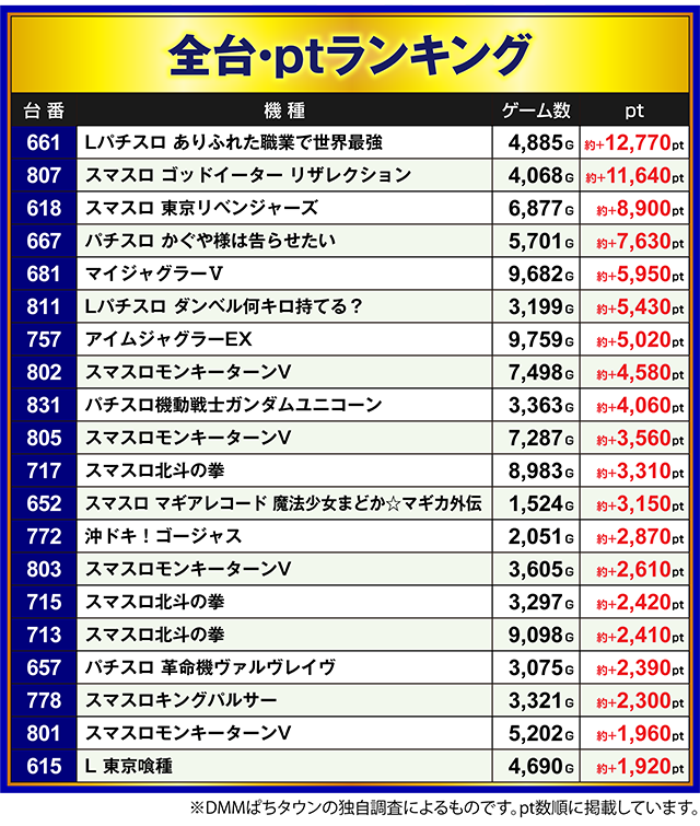 ほかにも、「スマスロ北斗の拳」の720番台や「Lパチスロ ありふれた職業で世界最強」の661番台なども約+6,100ptオーバー。