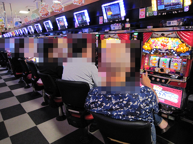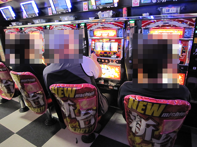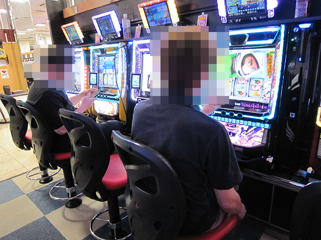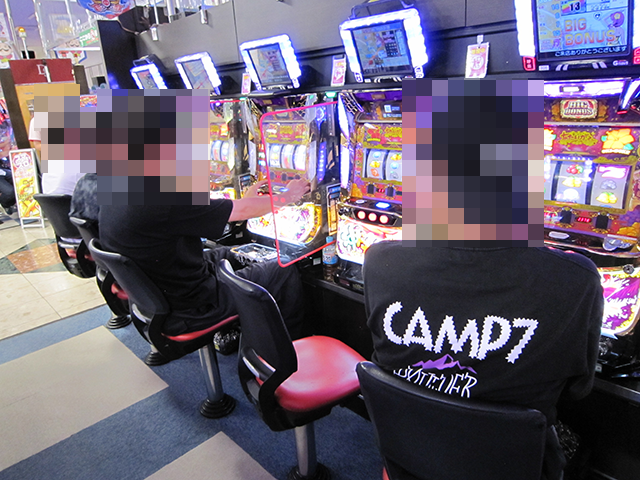 「ネオアイムジャグラーEX」と「マイジャグラーⅤ」の両方に、持ち玉を使い、笑顔で遊技をおこなっている姿があった。