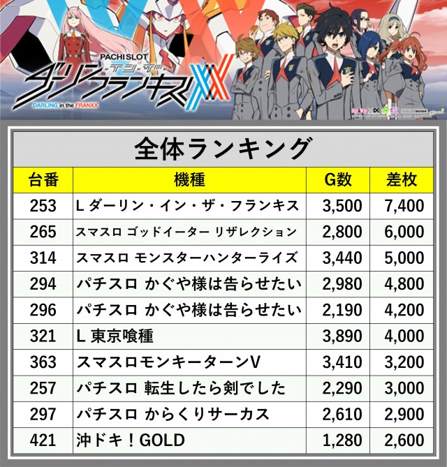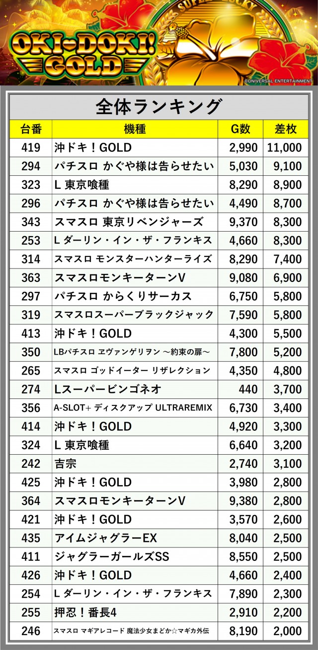 厳選された取材対象機種をはじめ、その他スロット全体から好記録が飛び出した!プレイヤーが楽しんだ1日を下記データにて振り返ってみて欲しい。