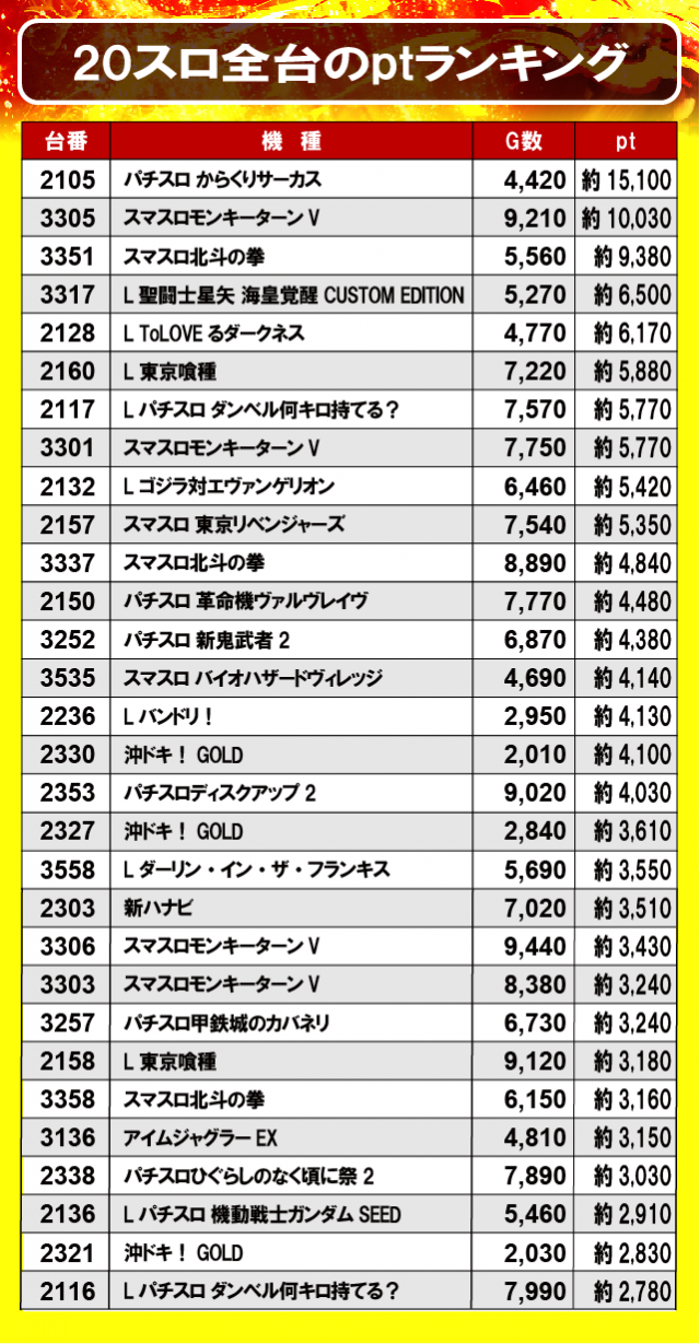 ①20スロ全台のptランキング
