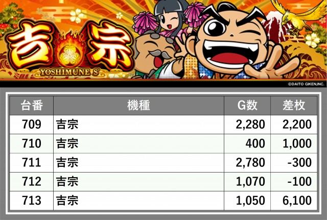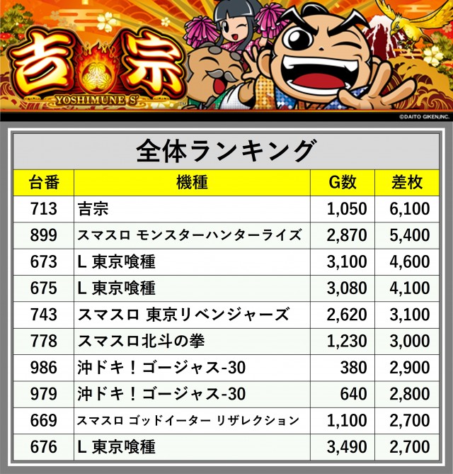 厳選された取材対象機種をはじめ、その他スロット全体から好記録が飛び出した!プレイヤーが楽しんだ1日を下記データにて振り返ってみて欲しい。