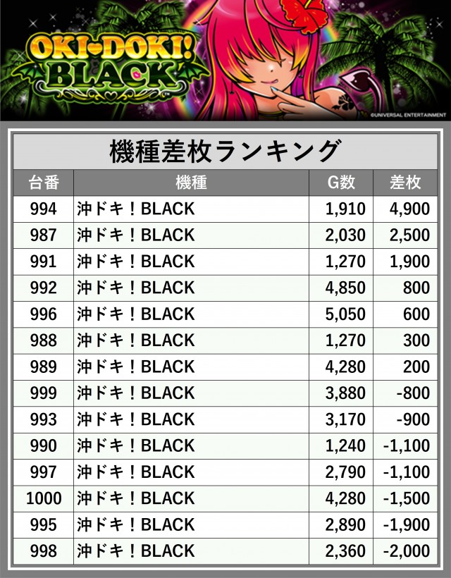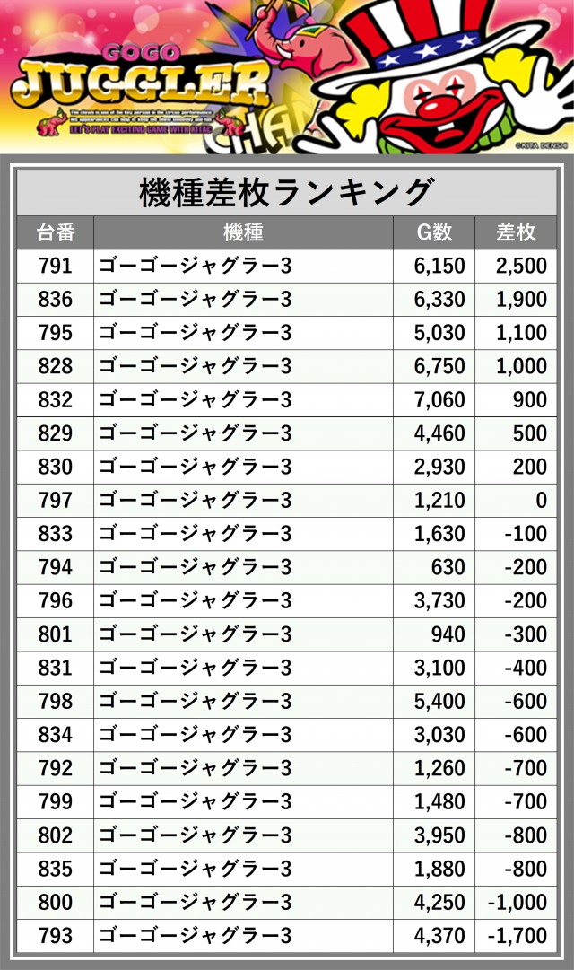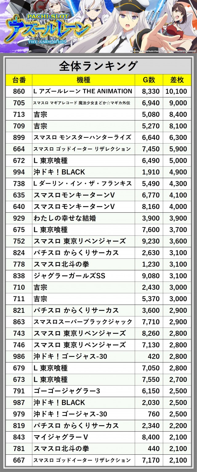 ※差枚数順に掲載しています