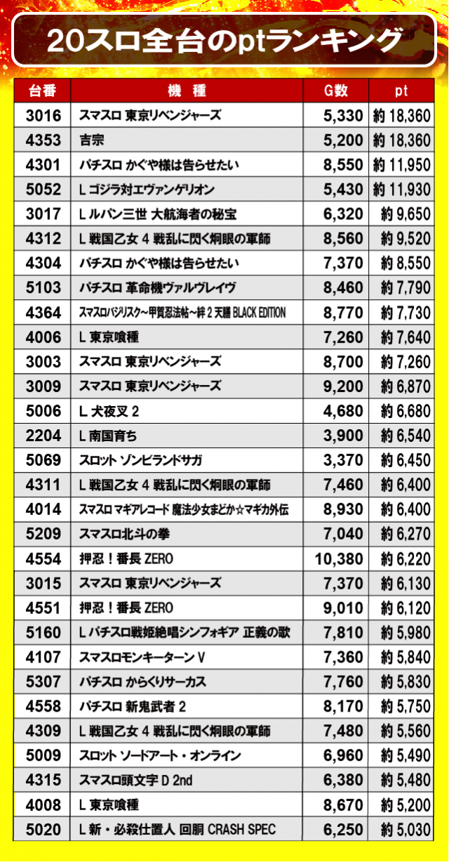 ①20スロ全台のptランキング