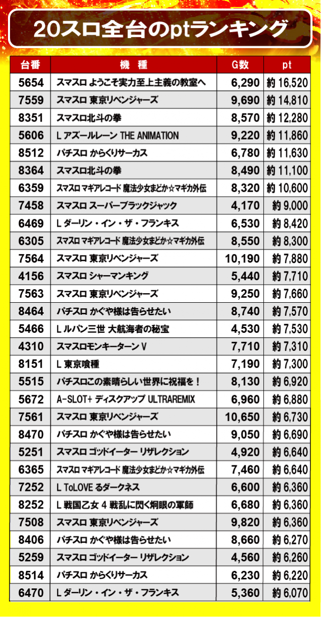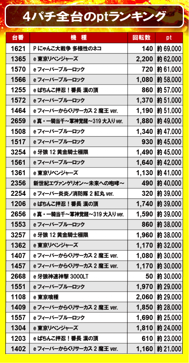 9台の万ptOVERを筆頭に活気溢れる状況が続き、さらには20スロptランキングTOP30は6,000ptOVERからとなっていた!閉店までその熱気が冷めることがなく、ファンの期待に応える素晴らしい内容だった!