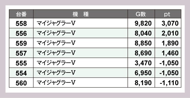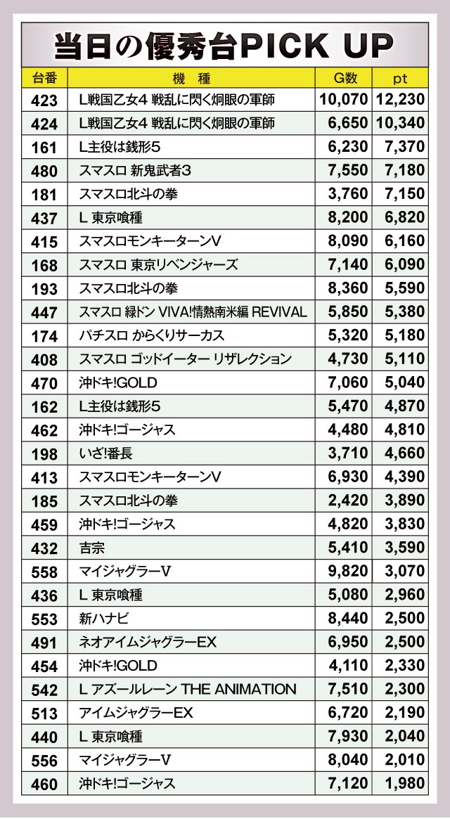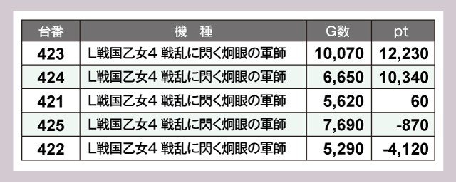 ひときわ輝いていたのは『L戦国乙女4 戦乱に閃く炯眼の軍師』。+10,000ptオーバーが2台と好成績をおさめている。他にも『L主役は銭形5』や『スマスロ 新鬼武者3』、『スマスロ北斗の拳』など、+7,000pt超が並ぶ。以下にも多数の優秀台が誕生し、見応えのあるデータができあがっていた。
