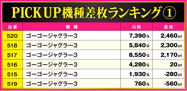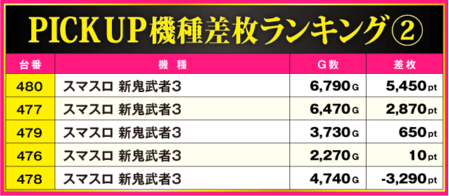 次にPICK UP機種の状況をチェックしていくと、『ゴーゴージャグラー3』は+2,000pt超が3台、『スマスロ 新鬼武者3』は+5,450ptが発生している。さらに、『スマスロスーパーブラックジャック』は全3台中2台がプラス差枚となっているだけに、それぞれのシマは常に活気に満ち溢れる一日となった。