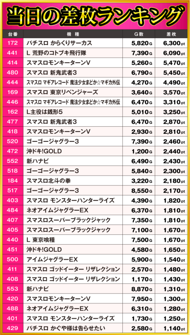 この日は、未だ人気の衰え知らずな大ヒット機種『パチスロ からくりサーカス』が+6,300ptを叩き出しランキングトップに。次いで、導入直後の新台『L 荒野のコトブキ飛行隊』が僅差の+6,090pt超を記録。そのポテンシャルの高さを早くも披露しプレイヤーの注目を集めていた。