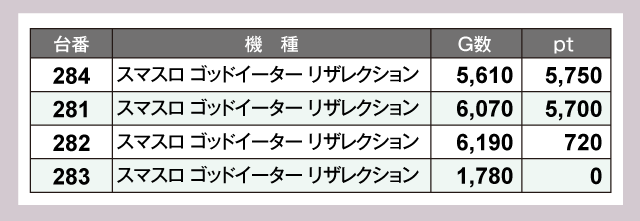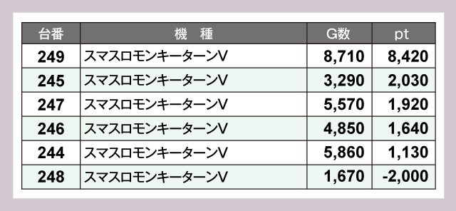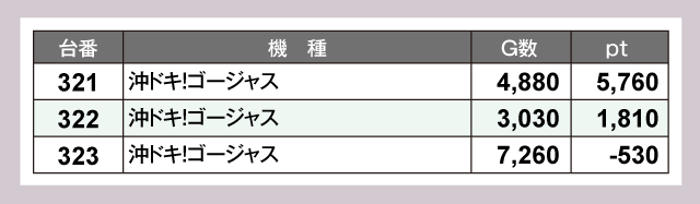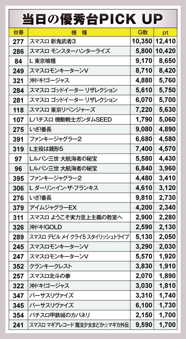 『スマスロ 新鬼武者3』277番台が+12,410pt、『スマスロ モンスターハンターライズ』286番台が+10,420ptと、1万ptオーバーが2台あらわれデータを彩っていた。つづいて『L 東京喰種』84番台が+8,650pt、『スマスロモンキーターンV』249番台が+8,420ptと並ぶ。以下にも『沖ドキ!ゴージャス』321番台の+5,760pt、『スマスロ ゴッドイーター リザレクション』284番台の+5,750pt、281番台の+5,700ptなど超優秀台が多数誕生していた。
