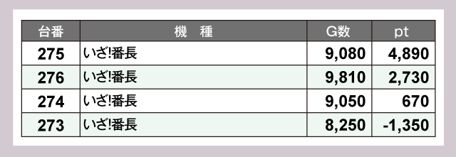 『いざ!番長』は4台すべてが非常に高稼働。3台がプラスptで大きな成果をあげている。