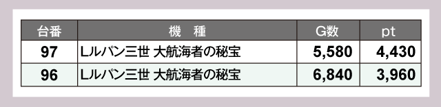 『沖ドキ!ゴージャス』は3台中2台がプラスpt。『Lルパン三世 大航海者の秘宝』は2台いずれもが大幅プラスptと、プレイヤー大満足の結果をもたらしていた。