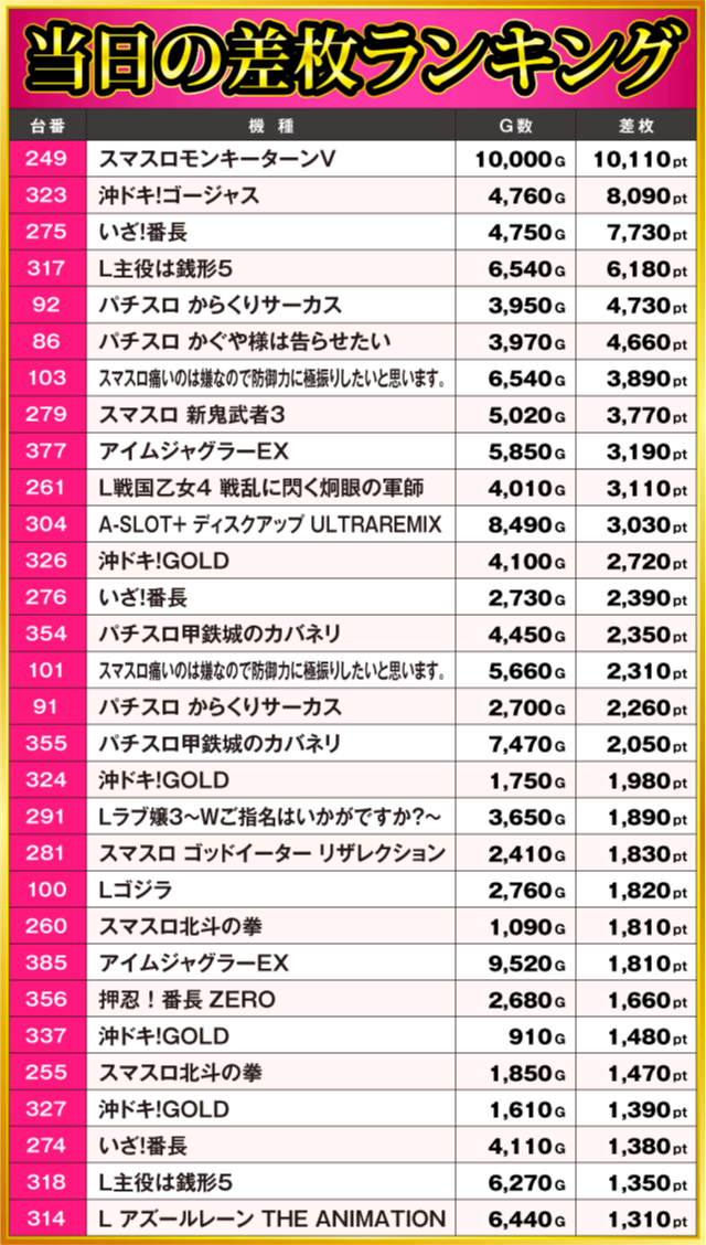 この日、最もプレイヤーの注目を集めたのが『スマスロモンキーターンV』で、249番台が万枚超の+10,110ptを叩き出しランキングトップに。次いで『沖ドキ!ゴージャス』が+8,090pt、『いざ!番長』が+7,730ptを記録するなど、人気のスマスロを中心にハイスコアが続出し店内を盛り上げていた。