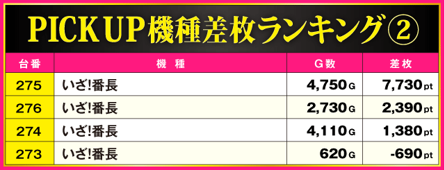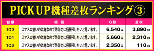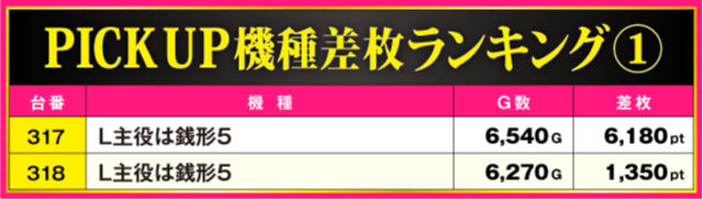 続いてPICK UP機種の状況をチェック!! 好成績が飛び出した『いざ!番長』以外にも多数の好調台が確認されており、『L主役は銭形5』から+6,180pt、『スマスロ痛いのは嫌なので防御力に極振りしたいと思います。』からは+3,890ptが発生。しかも、3機種合わせた全9台中8台がプラス差枚となる圧巻の結果を残している。