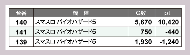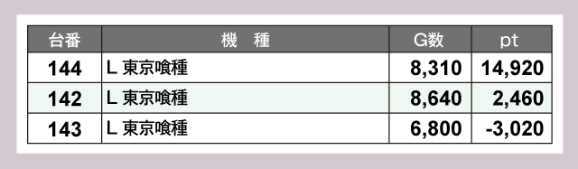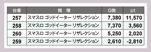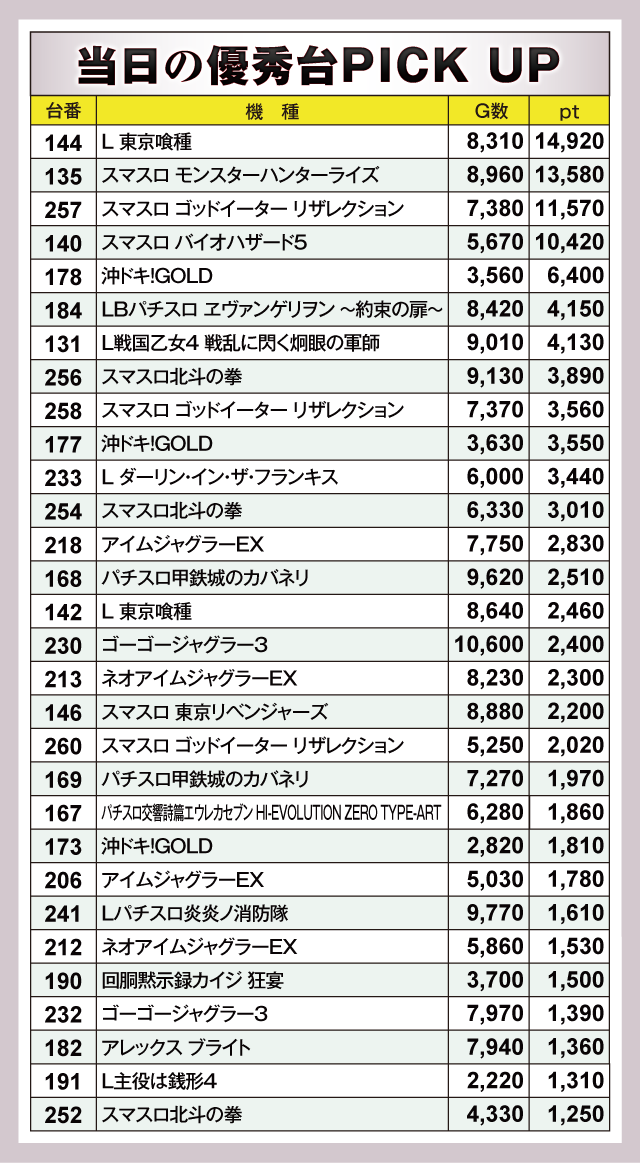 燦然と輝いたのは『L 東京喰種』。144番台が+14,920ptと圧倒的な成績をのこしている。つづいて『スマスロ モンスターハンターライズ』135番台が+13,580ptとこれまた超優秀な結果に。さらに『スマスロ ゴッドイーター リザレクション』257番台が+11,570pt、『スマスロ バイオハザード5』140番台が+10,420ptと、1万ptオーバーが4台うまれていた。以下『沖ドキ!GOLD』178番台の+6,400ptなどなど、店内の熱気を証明するデータが並んでいる。