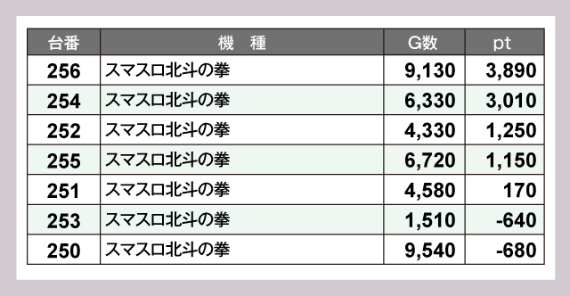 『スマスロ バイオハザード5』は3台中1台が1万pt達成。いまだに支持を集める『スマスロ北斗の拳』からは4桁プラスptを複数確認。中心機種としての実力を発揮している。