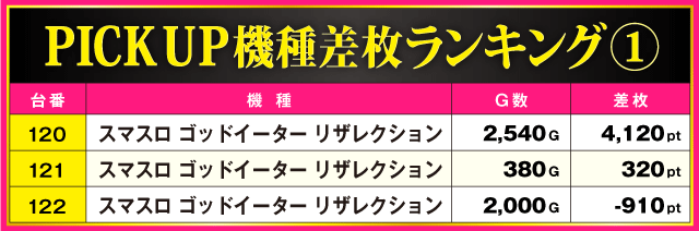次にPICK UP機種の状況をチェック!! ハイスコアを記録した『スマスロ ゴッドイーター リザレクション』は3台中2台がプラス差枚で終了。ランキング1位を獲得した『パチスロ かぐや様は告らせたい』も好調で、総差枚数はプラスとなった。