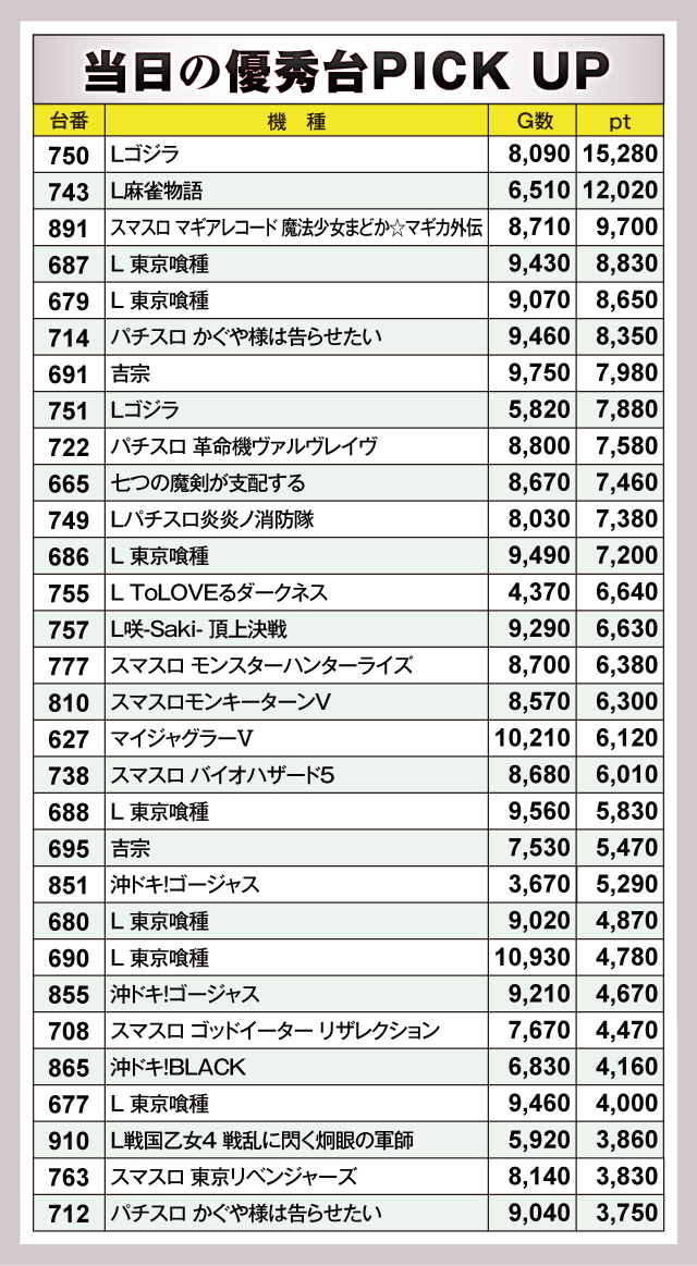 『Lゴジラ』750番台が+15,280ptと、驚異的な成績を叩きだしている。そして『L麻雀物語』743番台が+12,020pt、『スマスロ マギアレコード 魔法少女まどか☆マギカ外伝』891番台が+9,700ptと、負けず劣らずの好成績でつづいた。さらに『L 東京喰種』687番台の+8,830pt、679番台の+8,650pt、『パチスロ かぐや様は告らせたい』714番台の+8,350ptと並ぶ。他にも4桁プラス後半の超優秀台が多数うまれ、なんとも華やかな1日となっていた。