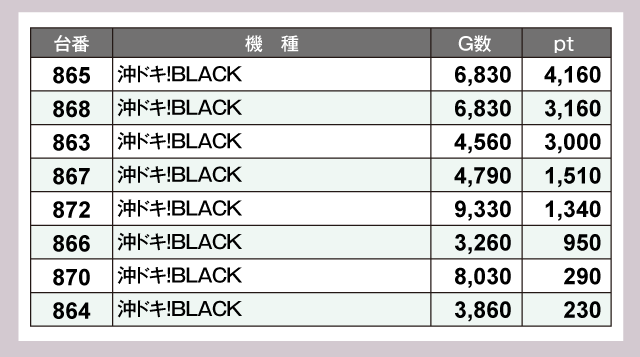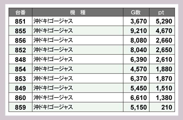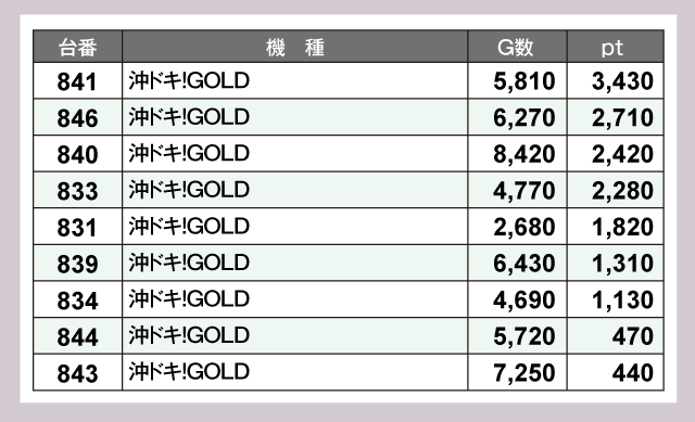 人気の『沖ドキ』シリーズである『沖ドキ!ゴージャス』と『沖ドキ!BLACK』、『沖ドキ!GOLD』は、稼働の面でもptの面でも非常に優秀な結果となった。同店における力の入れ具合がうかがえる。