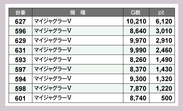 『ジャグラー』シリーズからは『マイジャグラーⅤ』をピックアップ。こちらもかなりの高稼働で、1万G超えの627番台が+6,120ptと華々しい成果をあげていた。