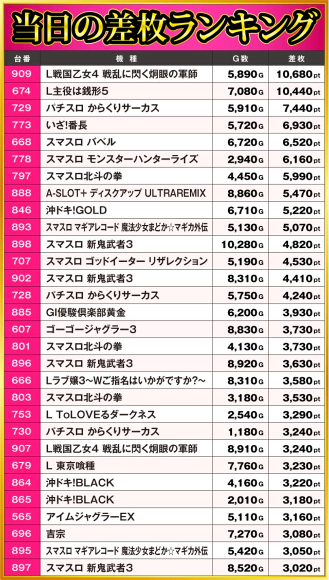 この日は、『L戦国乙女4 戦乱に閃く炯眼の軍師』と『L主役は銭形5』が万枚超を達成。次いで『パチスロ からくりサーカス』が+7,440pt、『いざ!番長』と『スマスロ バベル』、『スマスロ モンスターハンターライズ』が+6,000pt超を記録するなど、新旧を問わず様々な機種からハイスコアが続出している。