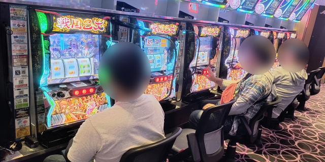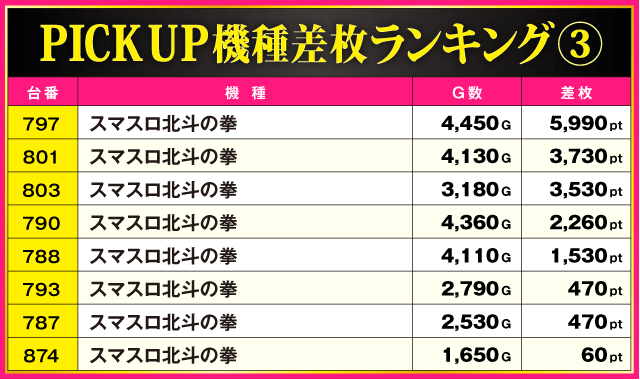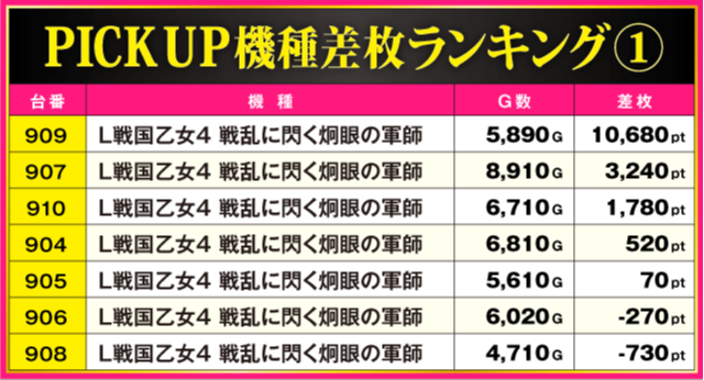 続いてPICK UP機種の状況をチェック!! ランキングを制した『L戦国乙女4 戦乱に閃く炯眼の軍師』は、最終的に全7台中5台がプラス差枚となる見事な結果に。さらに、『沖ドキ!GOLD』と『スマスロ北斗の拳』はともに+5,000pt超が飛び出しているだけに、3機種のシマは常に活気に満ち溢れる一日となった。