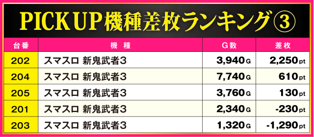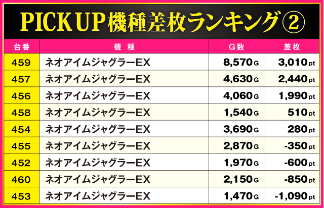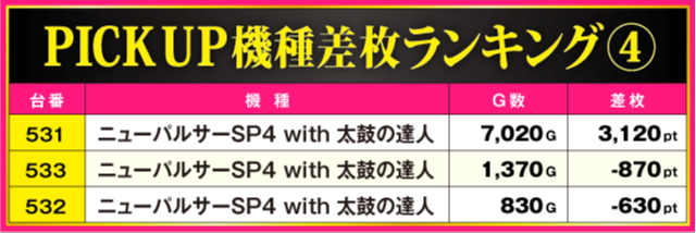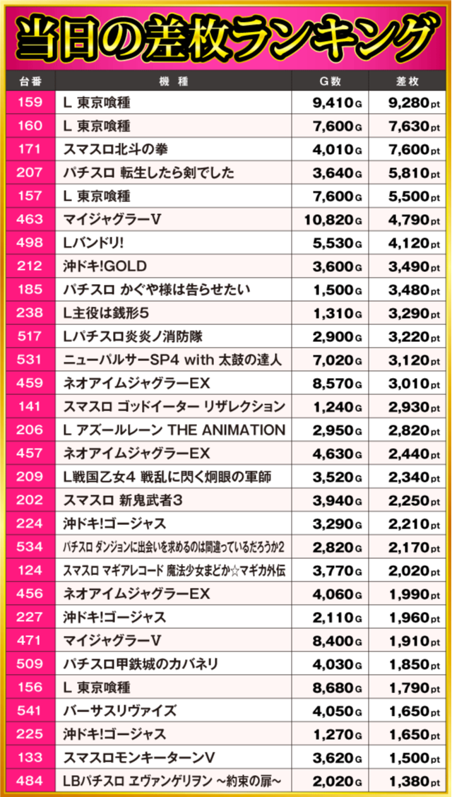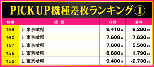 今回のPICK UP機種は全4機種。『ネオアイムジャグラーEX』と『ニューパルサーSP4 with 太鼓の達人』が+3,000pt超を記録するなど、ランキングを制した『L 東京喰種』以外にも多数の好調台が確認されている。最終的に4機種トータルの全22台中13台がプラス差枚で実戦を終えているだけに、それぞれのシマは常に活気に満ち溢れる一日となった。