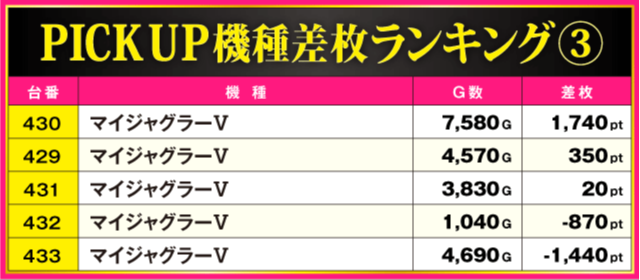次にPICK UP機種の状況を見ていくと、差枚上位にランクインした台以外からも複数の好調台を確認。最終的に3機種トータルの全9台中6台がプラス差枚となる見事な結果を残しているだけに、ファンにとって充実の一日となったのは間違いないだろう。