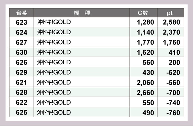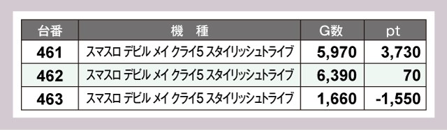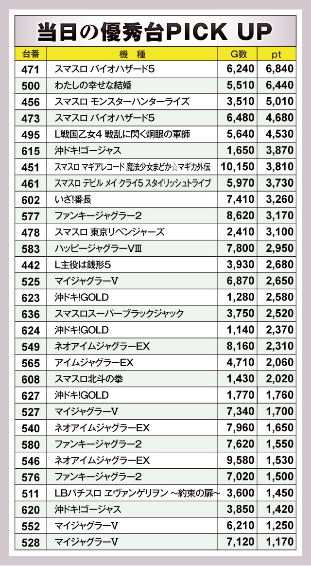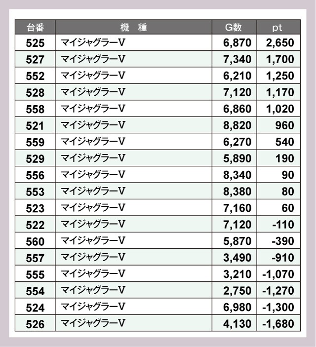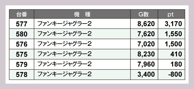 『ファンキージャグラー2』はほとんどの台が高稼働で、577番台を含む3台が4桁プラスptの大活躍。『マイジャグラーⅤ』は半数以上の台がプラスptと安定感抜群だった。