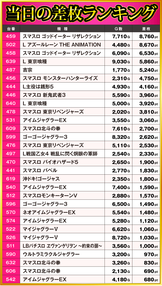 この日、『スマスロ ゴッドイーター リザレクション』と『L アズールレーン THE ANIMATION』が+8,000ptを記録し注目を集めた。ほかにも『L 東京喰種』などから+5,000pt超が飛び出すなど、人気のスマスロを中心に好成績が続出し店内を盛り上げていた。