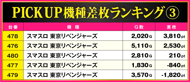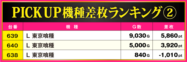 次にPICK UP機種の状況をチェック!! ハイスコアを記録した『スマスロ ゴッドイーター リザレクション』からは+8,760pt、+6,530ptといった好成績が発生。『L 東京喰種』は3台中2台が大幅プラスの大盛況となった。『スマスロ 東京リベンジャーズ』は全5台中3台がプラス差枚で実戦を終えているだけに、それぞれのシマは常に活気に満ち溢れていた。