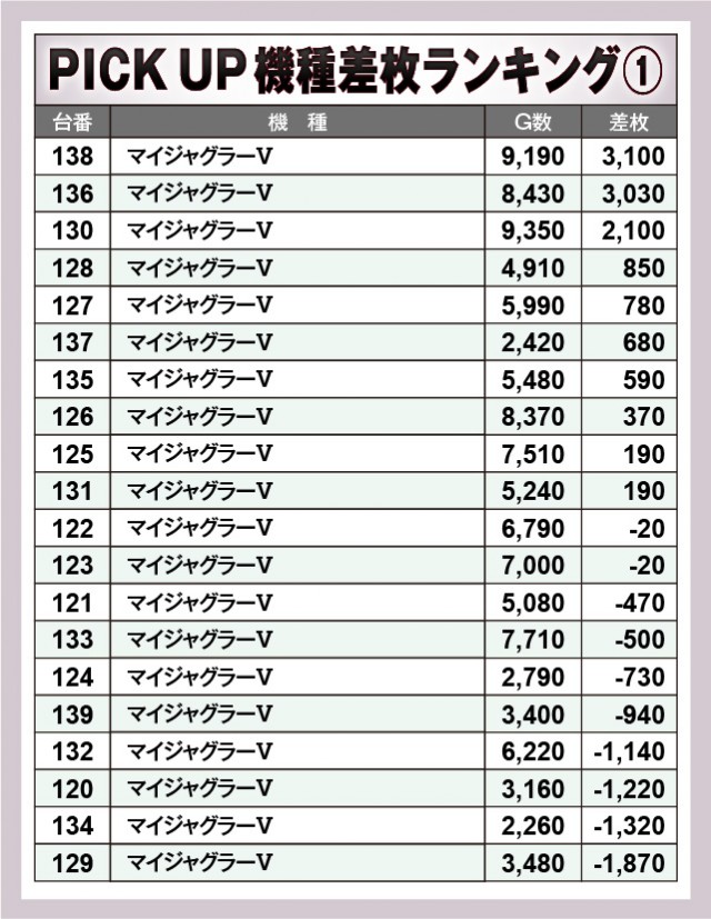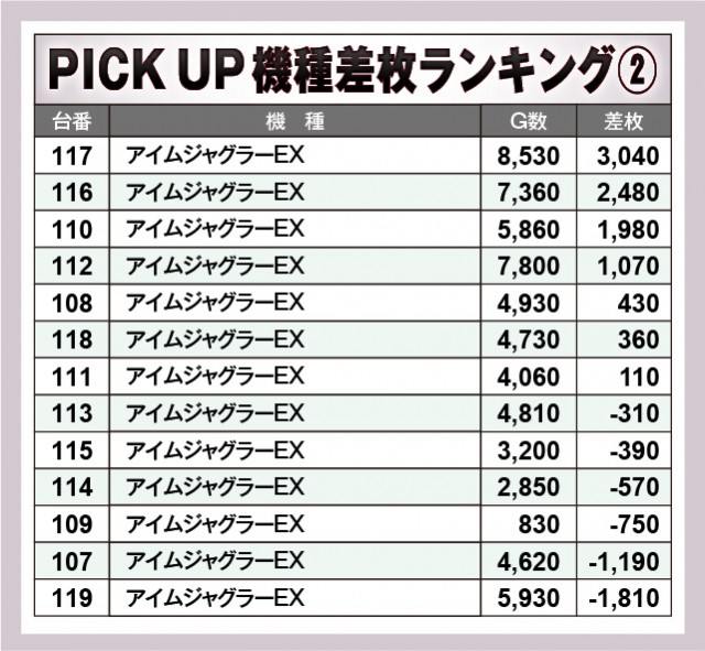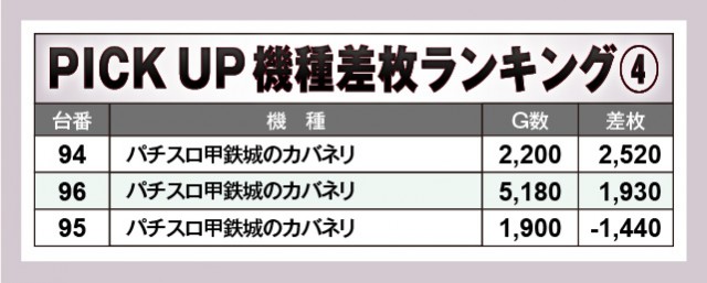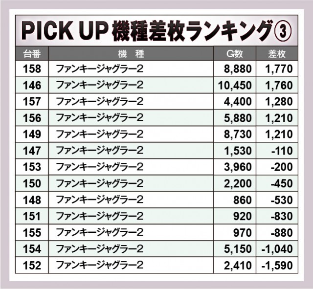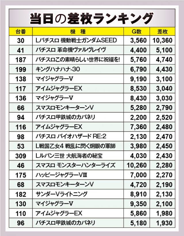 ノーマル機の活躍が目立った1日になのは間違いなく、上表の『マイジャグラーⅤ』『アイムジャグラーEX』『ファンキージャグラー2』の詳細データをご覧になれば分かるだろう。高い活気で終日を通して賑わうばかりか、右肩上がりのグラフを形成していたのが目に焼きつくばかり。また『パチスロ甲鉄城のカバネリ』もポテンシャルを秘めた台のひとつで、メダル機ながら熱を帯びていたのも見逃せないポイントだ。