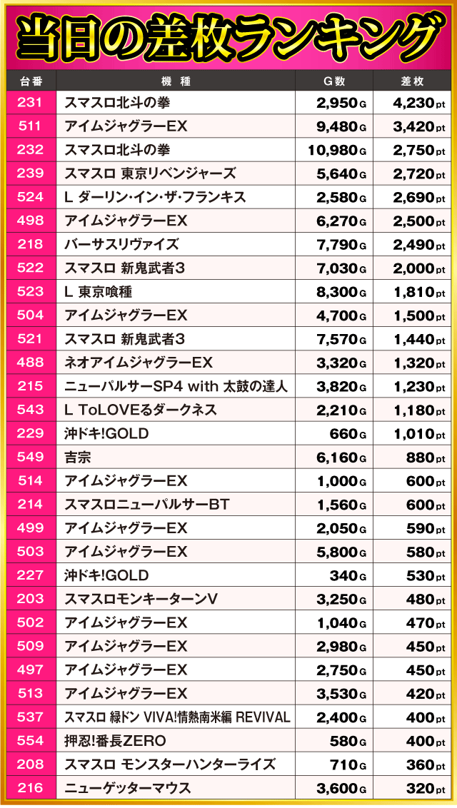 この日は、『スマスロ北斗の拳』が+4,230ptを叩き出しランキングトップに。次いで『アイムジャグラーEX』が+3,420ptを記録するなど、人気のスマスロからボーナスタイプまでハイスコアが続出し店内を盛り上げていた。