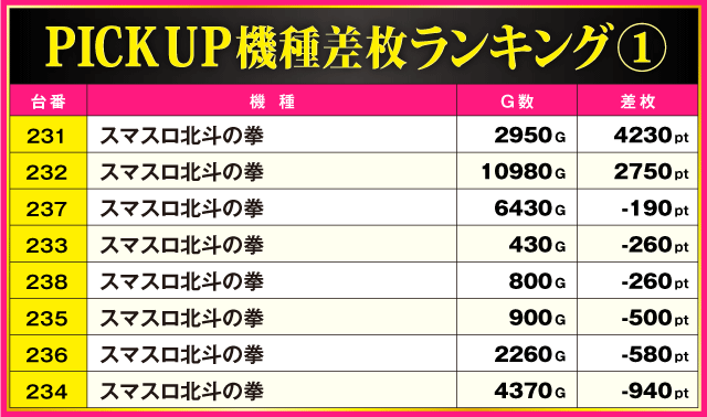 今回のPICK UP機種は差枚上位にランクインした『スマスロ北斗の拳』。最終的に全8台中2台がプラス差枚と少し物足りない結果にはなったもののプラス台はどちらも4桁ptと絶好調だった。