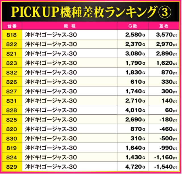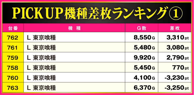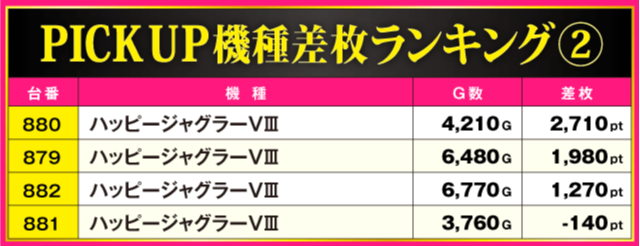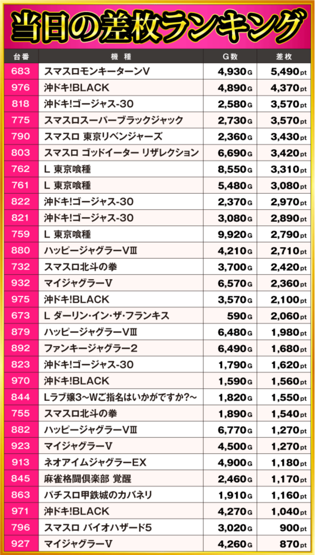 この日は、同店のメイン機種である『L 東京喰種』や地域最多設置の沖ドキ!シリーズが特に賑わいを見せており多数の好調台、好成績が確認されている。また、Aタイプではジャグラーシリーズが大奮闘!! 『ハッピージャグラーVⅢ』の+2,710ptを筆頭に様々な機種が差枚TOP30にランクインする盛況ぶりを見せている。
