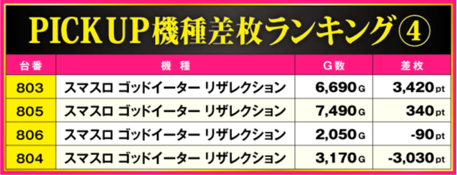 今回のPICK UP機種は全4機種。ハイスコアが飛び出した『L 東京喰種』や『ハッピージャグラーVⅢ』以外に『沖ドキ!ゴージャス-30』と『スマスロ ゴッドイーター リザレクション』からも+3,000pt超が発生しており、それぞれのシマは常にファンの笑顔と活気に満ち溢れる一日となった。