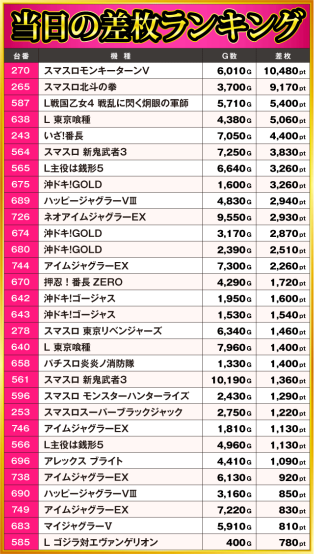 当日の差枚ランキング