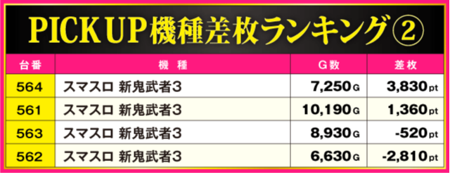 次にPICK UP機種の状況をチェックしていくと、『L 東京喰種』からは+5,060pt、『スマスロ 新鬼武者3』からは+3,830ptが発生。さらに、『アイムジャグラーEX』からも多数の好調台が確認されており、最終的に半数の台がプラス差枚で実戦を終える見事な結果を残している。