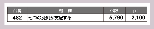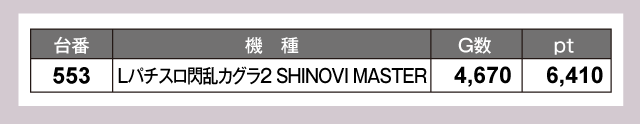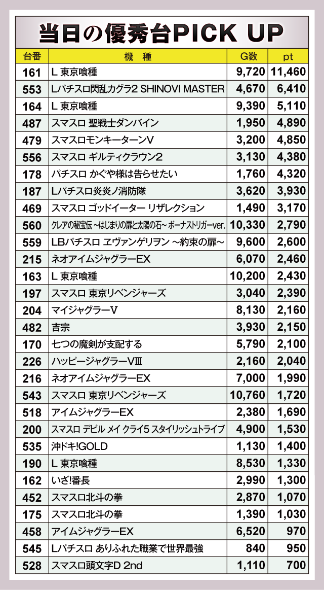 『L 東京喰種』161番台が+11,460ptと、ひときわ輝く成績をおさめた。おなじく164番台も+5,110ptと優秀な結果に。そして『Lパチスロ閃乱カグラ2 SHINOVI MASTER』553番台が+6,410ptで追随。他にも『スマスロ 聖戦士ダンバイン』487番台の+4,890pt、『スマスロモンキーターンV』479番台の+4,850ptなどなど、訪れたプレイヤーたちを満足させるデータが並んでいる。