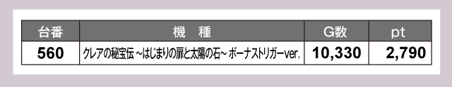 1台ずつ設置の『クレアの秘宝伝 〜はじまりの扉と太陽の石〜 ボーナストリガーver.』と『七つの魔剣が支配する』、『Lパチスロ閃乱カグラ2 SHINOVI MASTER』は全台がプラスpt。それぞれが存在感を強くアピールしていた。