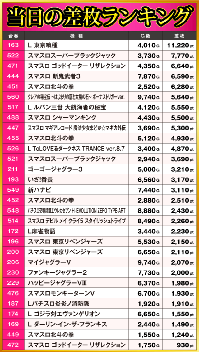 この日は、『L 東京喰種』が万枚超の+11,220ptを叩き出しランキングトップに。次いで『スマスロスーパーブラックジャック』が+7,770pt、『スマスロ ゴッドイーター リザレクション』が+6,640ptを記録している。また、導入直後の最新台『スマスロ 新鬼武者3』からも+6,590ptが飛び出しており、そのポテンシャルの高さを早くも披露していた。