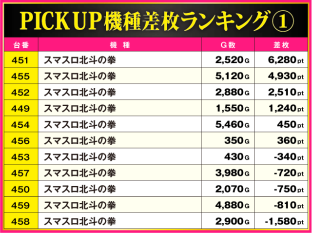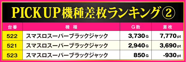 今回のPICK UP機種は全3機種。差枚上位にランクインした『スマスロスーパーブラックジャック』と『スマスロ ゴッドイーター リザレクション』以外にも『スマスロ北斗の拳』から+6,280ptが確認されている。さらに、最終的に3機種トータルの全18台中11台がプラス差枚となっているだけに、ファンにとって充実の一日となったのは間違いないだろう。
