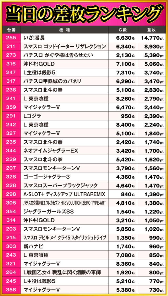 この日、最もプレイヤーの注目を集めたのが『いざ!番長』で、255番台が圧巻の+14,770ptを叩き出しランキングトップに。次いで『スマスロ ゴッドイーター リザレクション』が+8,930pt、『パチスロ かぐや様は告らせたい』と『沖ドキ!GOLD』が+5,000pt超を記録するなど、人気機種を中心にハイスコアが続出し店内を盛り上げていた。