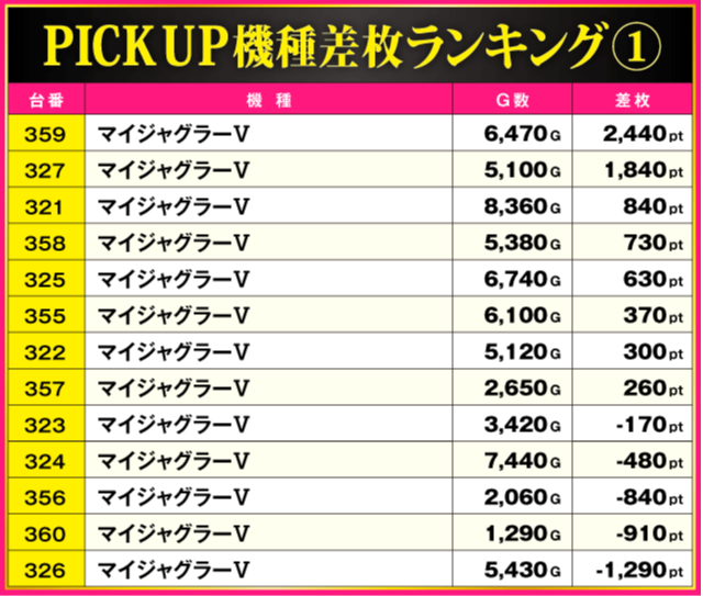 今回のPICK UP機種は『マイジャグラーⅤ』。359番台の+2,440ptを皮切りに多数の好調台が確認されており、最終的に全13台中8台がプラス差枚に。本機ならではの圧倒的な安定感を存分に発揮しているだけに、ファンとって充実の一日となったのは間違いないだろう。