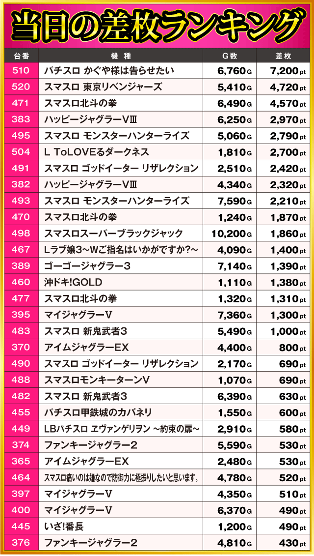 この日は、『パチスロ かぐや様は告らせたい』が+7,200ptを叩き出しランキングトップに。次いで『スマスロ 東京リベンジャーズ』から+4,720pt、『スマスロ北斗の拳』から+4,570ptなど、人気のスマスロを中心に多数のハイスコアが確認されている。