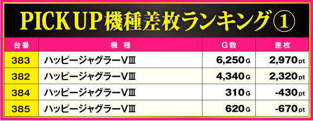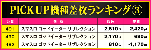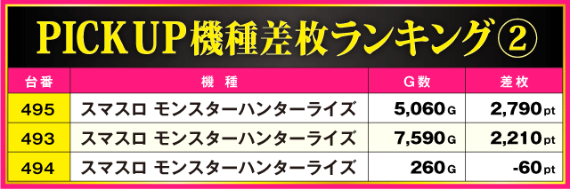 今回のPICK UP機種は3機種。『ハッピージャグラーVⅢ』では4台中2台が+2,000pt超と大盛り上がり。『スマスロ モンスターハンターライズ』と『スマスロ ゴッドイーター リザレクション』はどちらも3台中2台がプラスとなる見事な結果を残しているだけに、ファンにとって充実の一日となったのは間違いないだろう。