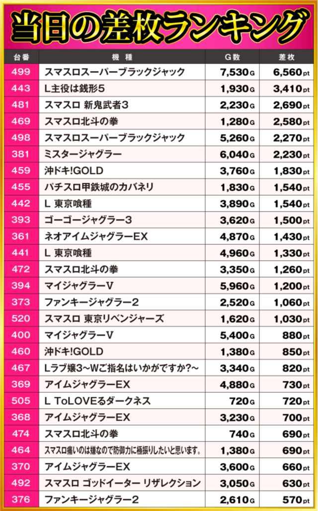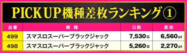 この日は、『スマスロスーパーブラックジャック』から+6,560ptが飛び出しランキングトップに。次いで、導入間もない『L主役は銭形5』が+3,410pt、『スマスロ 新鬼武者3』が+2,690ptを記録するなど、人気機種から新台まで広範囲に渡って多数の好調台が確認されている。