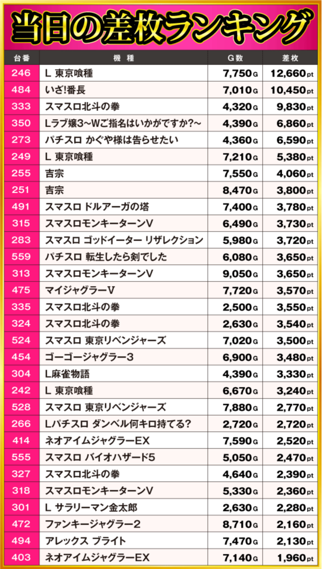 当日の差枚ランキング