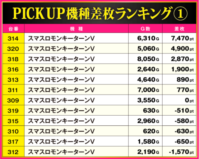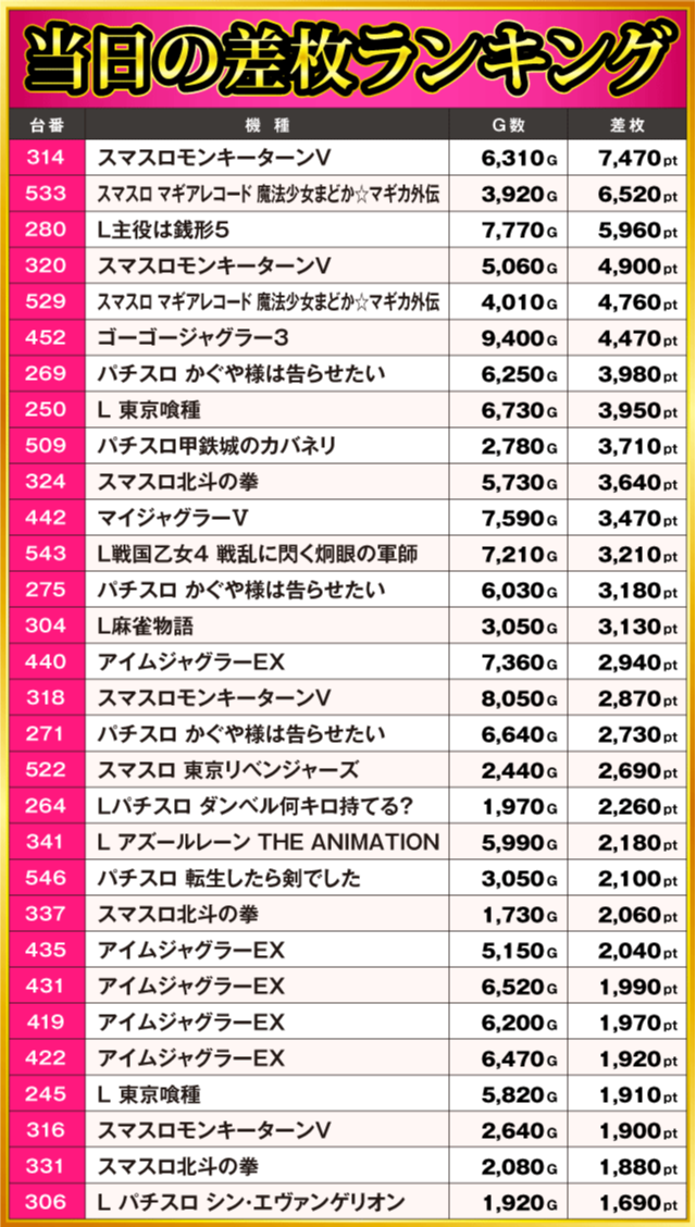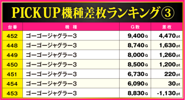 今回のPICK UP機種は全3機種。差枚上位にランクインした『スマスロモンキーターンV』と『スマスロ マギアレコード 魔法少女まどか☆マギカ外伝』は、両機種ともその他の台から+4,000pt超といった好成績が発生。さらに、『ゴーゴージャグラー3』は+4,470ptが飛び出している上に全7台中6台がプラス差枚となる見事な結果を残している。
