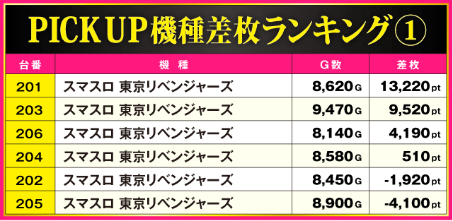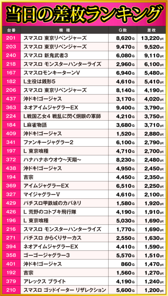 この日、最もプレイヤーの注目を集めたのが『スマスロ 東京リベンジャーズ』で、201番台の+13,220ptを皮切りに+9,520pt、+4,190ptといったハイスコアを連発。さらに、『スマスロ 新鬼武者3』が+9,110pt、『スマスロモンキーターンV』と『L主役は銭形5』が+5,000pt超を叩き出し店内を盛り上げていた。